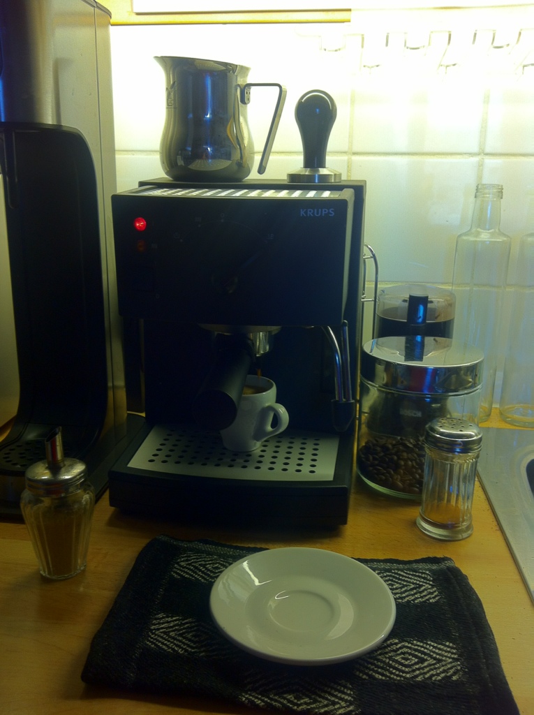My old Krups machine still lives on and every now and then I take for a spin to have a go at that manual espresso making experience with coffee grinds, a heavy metal tamper, and the steam huffin ‘n puffin.