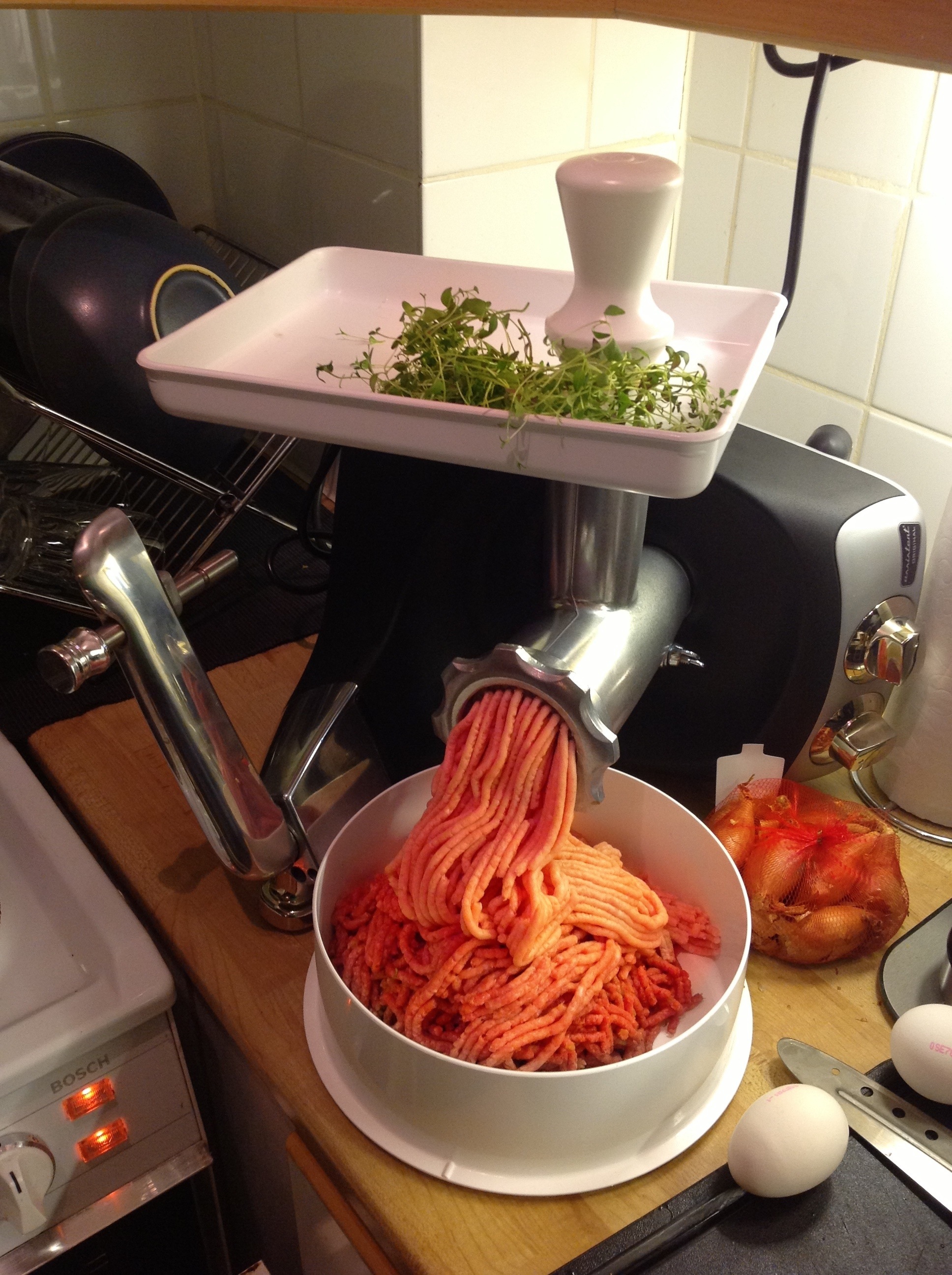 Mix the milk with the breadcrumbs and allow to swell. Peel and finely chop the onion. Mix all the ingredients in a bowl and stir until smooth. I added some fresh green herbs to the mix.