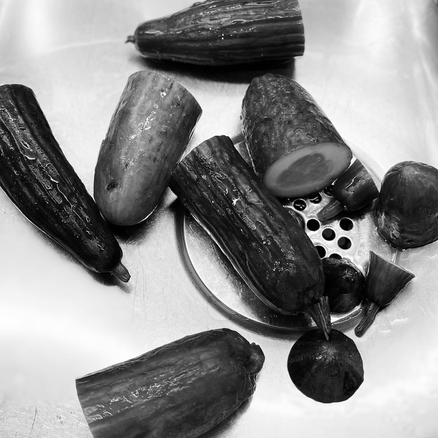 Några väntade skavanker i änden på varje gurka skars bort. Ungefär 70% kvar av superfin ekologisk gurka, 30% gick till kompostering.