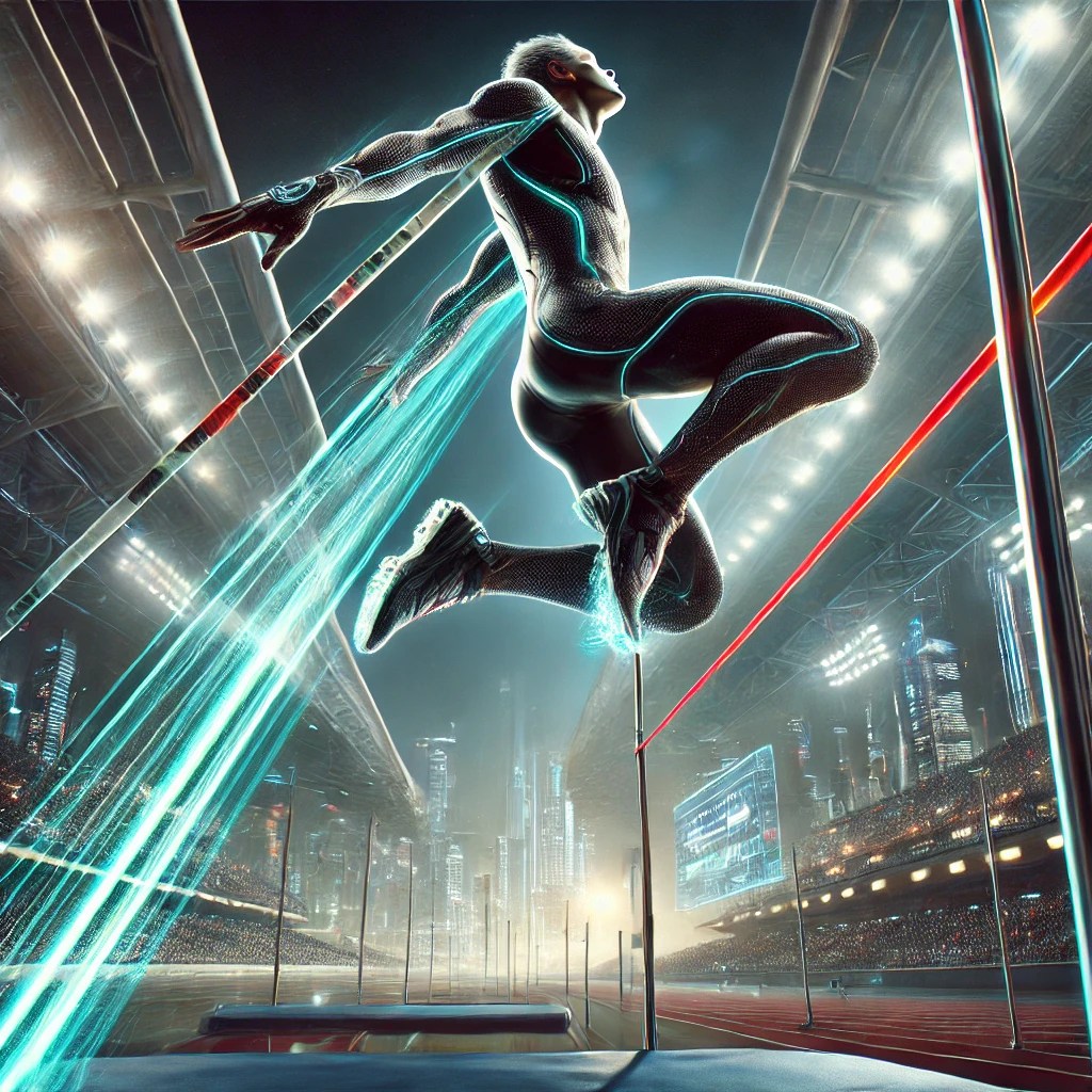 “A world-class pole vaulter soaring high above the bar in mid-air, captured in an ultra-dynamic perspective. The scene takes place in a futuristic stadium, illuminated by neon lights and advanced technology. The athlete is wearing a sleek, aerodynamic uniform with a cutting-edge pole that glows with energy. The background features a dramatic skyline, either at sunset or under bright stadium lights. Motion blur, wind effects, and a cinematic glow add to the sense of power and movement. The composition highlights the athlete’s perfect form, with intense focus and determination visible on their face.”